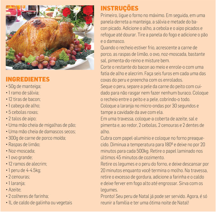 E falando em delícias de Natal, a Revista Exemplo® Variedades separou para você uma deliciosa receita de Peru que com certeza agradará todos os paladares exigentes na noite de Natal, confira: