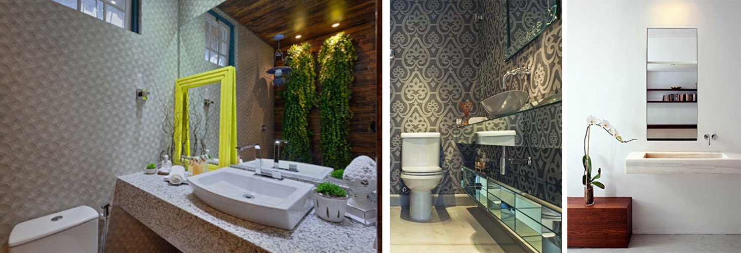Geralmente, os lavabos são áreas pequenas e para dar a sensação de amplitude, recomendamos usar espelhos, vidros e outros materiais translúcidos. A iluminação também é um fator de alta relevância e deve ser muito bem projetada.
