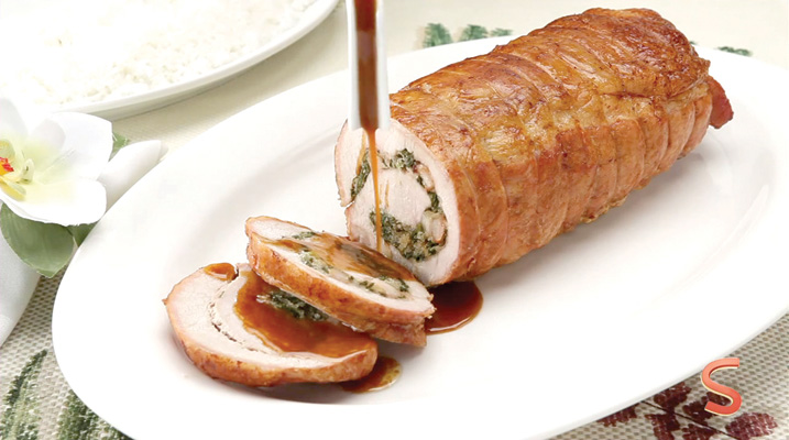 Em uma assadeira coloque o lombo recheado e leve para assar a 180° C coberto com papel alumínio por aproximadamente duas horas. • Retire o papel alumínio e deixe dourar por 20 minutos. Retire do forno, corte em fatias e sirva em seguida com o molho de espumante e o arroz com lentilha.