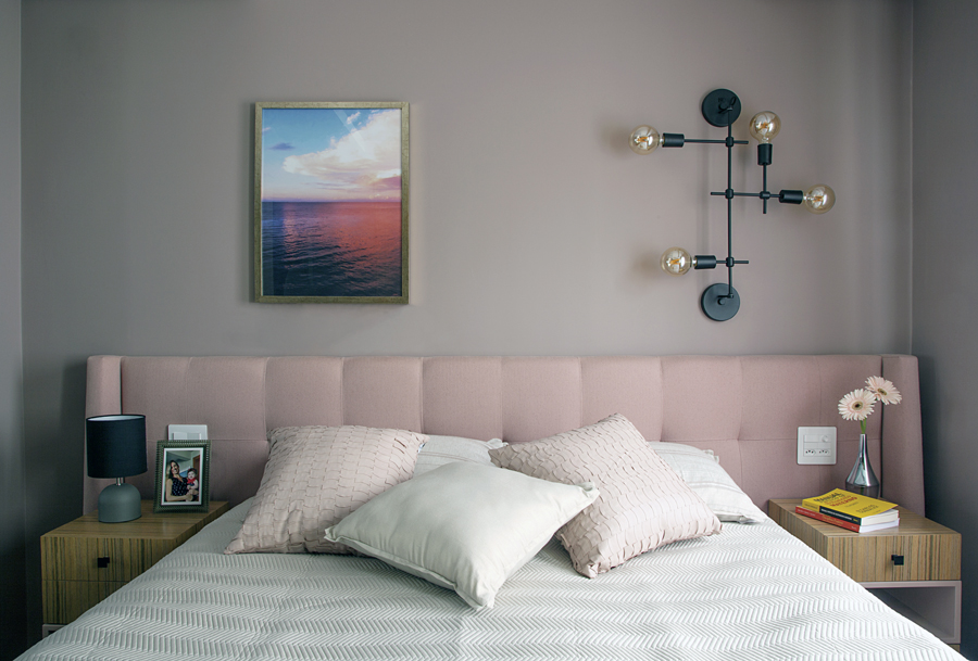 No briefing com o casal, duas prerrogativas: máximo conforto e a presença do rosa, cor favorita da moradora. Os profissionais investiram na tendência do monocromático ao escolherem um tom para as paredes e outro para a cabeceira.