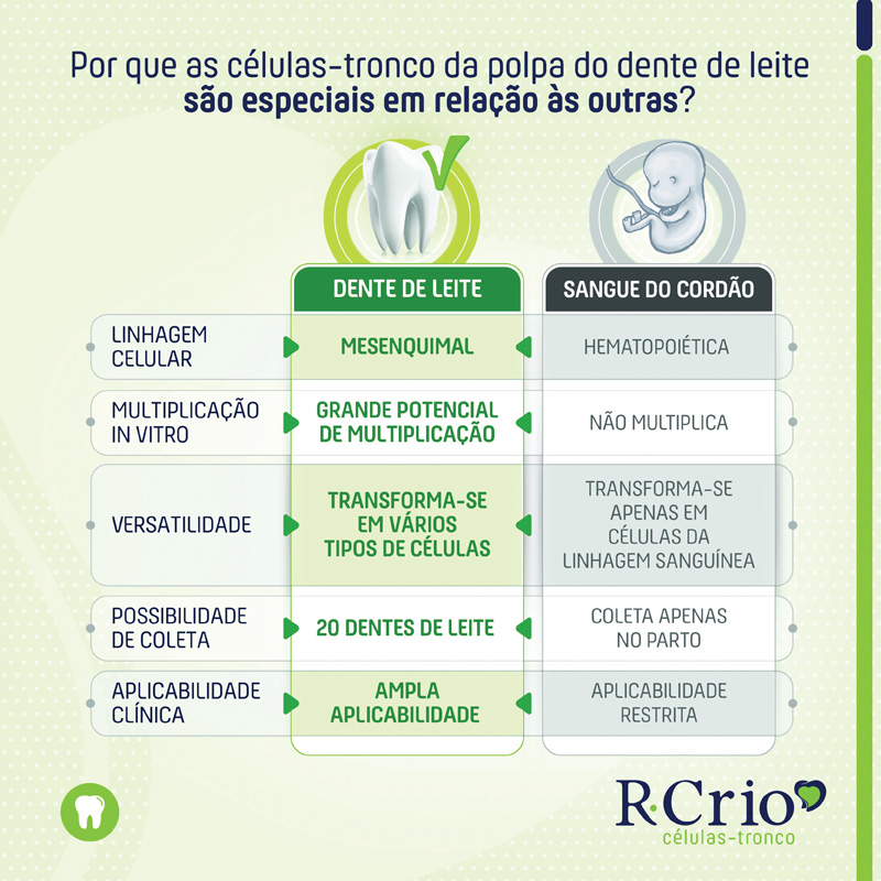 É necessária a avaliação clínica pelo dentista para a escolha do melhor dente a ser extraído, entre 6 e 12 anos de idade. A extração é feita no consultório. O dente extraído é acondicionado em um kit com uma solução de conservação específica e enviado em embalagem apropriada ao laboratório da R•Crio. Lá as células são extraídas da polpa, passam por processo de análise, expansão, se multiplicam (em 14 dias podem chegar a 6/7 milhões) e são submetidas a um rigoroso controle de qualidade, antes de serem criopreservadas em nitrogênio líquido a uma temperatura de -185 C.
