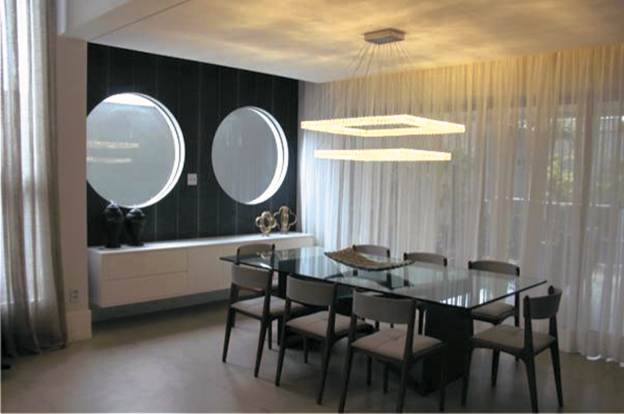 Nas salas de estar ou outros ambientes com televisores e com um fluxo maior de pessoas, alguns cuidados devem ser reforçados. “Com a televisão, precisamos pensar no ângulo de visão da mesma em todos os pontos do espaço, o modelo de pendente e o local de instalação também precisam ser escolhidos de acordo com as vias de circulação de pessoas para evitar acidentes”, conta a arquiteta.