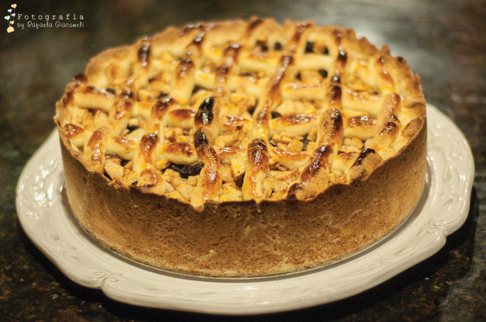 Deixe as passas de molho em água quente por 5 minutos e escorra, Descasque e pique as maçãs em pedaços pequenos misturando com todos os ingredientes. Deixe descansar enquanto prepara a massa.