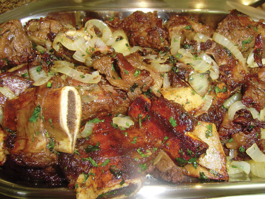 Em uma panela de pressão, forre o fundo com metade da cebola e coloque a costela. Em seguida coloque o restante da cebola e por último os tabletes de caldo de carne. Tampe a panela e leve ao fogo, quando começar a ferver abaixe o e deixe por 45 minutos, espere sair a pressão e coloque a costela em uma travessa, finalizando como molho que sobrou.